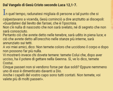 Agire nella verità è una linea guida forte del Vangelo, spesso poco accentuata in un mondo, una società, dove anche la comunità cristiana si inserisce, che ha fatto del compromesso ormai uno stile di vita. Un compromesso spesso dove si nascondono le verità per qualche pseudo bene. “Carità nella verità” diceva San Paolo e lo riprendeva Papa Benedetto XVI. Non è possibile vivere l’amore agli altri, pensare ed attuare della carità senza essere prima nella verità, dire la verità delle cose, insegnare la verità. Nulla di nascosto non verrà rivelato. Molto spesso capita a chi vuol fare il bene in maniera radicale e spendersi per ideali vari di sentirsi quasi un alieno, perché la logica del compromesso e del pseudo bene da raggiungere ad ogni mezzo ha confuso la verità. Non temere direbbe Gesù ha chi vive ciò. Non temere di non essere compreso di essere anche accusato forse perché tu vali tanto davanti a Dio.