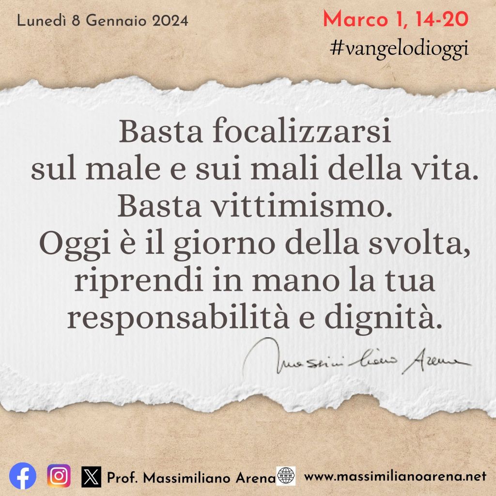 Oggi è tempo di conversione per passare dall’essere “pescatori di pesci” a “pescatori di uomini”. Oggi è il tempo della conversione, che significa “svolta”. Oggi Dio ti da ancora occasione. Raccogliamo le bellezze meditate nel tempo di Natale e riprendiamo in mano la vita. Responsabilità, tempo da investire bene e non vittimismo.