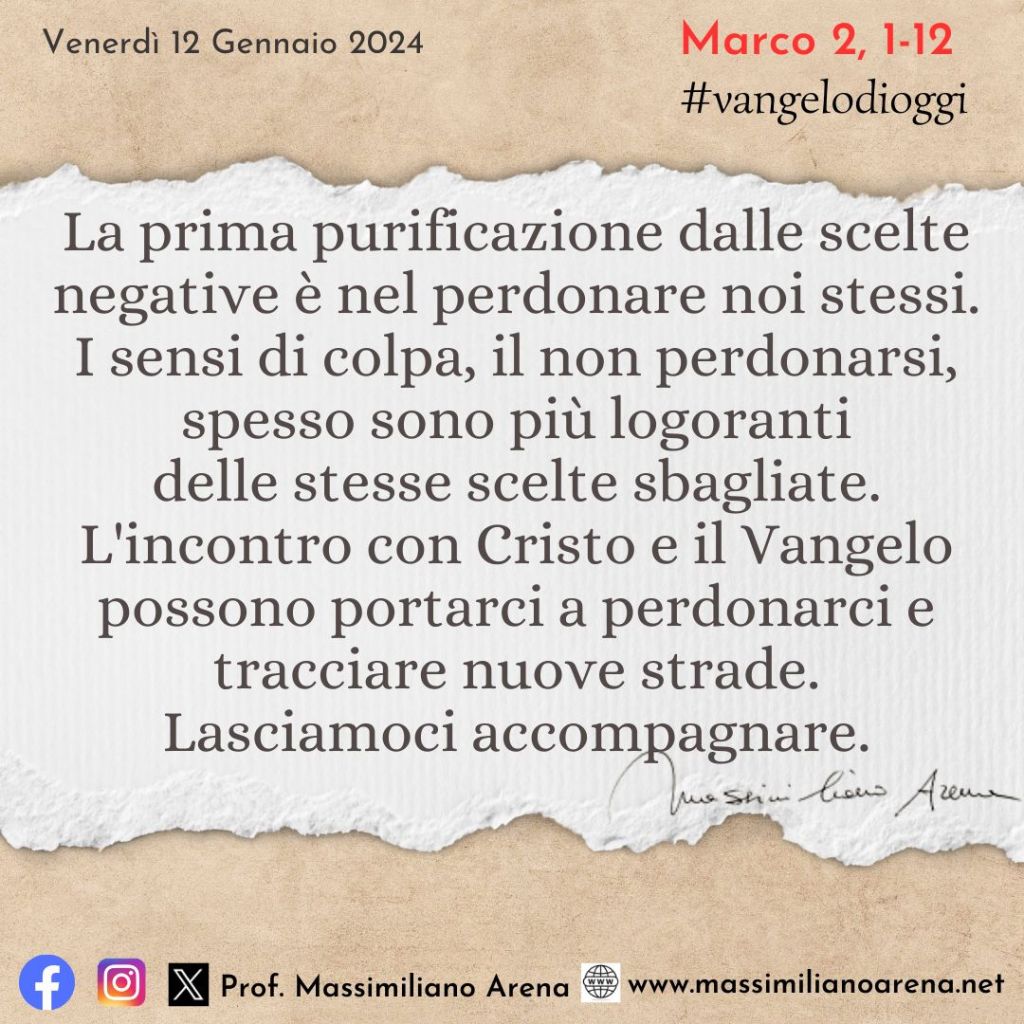 Erano seduti là alcuni scribi e pensavano in cuor loro: «Perché costui parla così? Bestemmia! Chi può perdonare i peccati, se non Dio solo?». E subito Gesù, conoscendo nel suo spirito che così pensavano tra sé, disse loro: «Perché pensate queste cose nel vostro cuore? Che cosa è più facile: dire al paralitico “Ti sono perdonati i peccati”, oppure dire “Àlzati, prendi la tua barella e cammina”? Ora, perché sappiate che il Figlio dell’uomo ha il potere di perdonare i peccati sulla terra, dico a te – disse al paralitico –: àlzati, prendi la tua barella e va’ a casa tua».