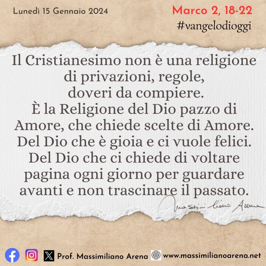 Siamo la Religione del Dio pazzo di Amore, che chiede scelte di Amore. Del Dio che è gioia e ci vuole felici. Del Dio che ci chiede di voltare pagina ogni giorno per guardare avanti e non trascinare il passato. Questo significa non mettere vino nuovo in otri vecchi o pezze nuove su vestiti vecchi. Il vado rischia di rompere e il vestito strapparsi col rischio di perdere il nuovo prezioso.