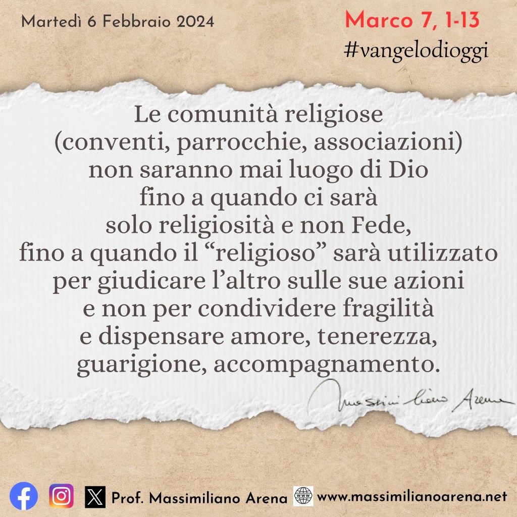 In quel tempo, si riunirono attorno a Gesù i farisei e alcuni degli scribi, venuti da Gerusalemme. Avendo visto che alcuni dei suoi discepoli prendevano cibo con mani impure, cioè non lavate – i farisei infatti e tutti i Giudei non mangiano se non si sono lavati accuratamente le mani, attenendosi alla tradizione degli antichi e, tornando dal mercato, non mangiano senza aver fatto le abluzioni, e osservano molte altre cose per tradizione, come lavature di bicchieri, stoviglie, di oggetti di rame e di letti -, quei farisei e scribi lo interrogarono: «Perché i tuoi discepoli non si comportano secondo la tradizione degli antichi, ma prendono cibo con mani impure?». Ed egli rispose loro: «Bene ha profetato Isaìa di voi, ipocriti, come sta scritto: “Questo popolo mi onora con le labbra, ma il suo cuore è lontano da me. Invano mi rendono culto, insegnando dottrine che sono precetti di uomini”. Trascurando il comandamento di Dio, voi osservate la tradizione degli uomini». E diceva loro: «Siete veramente abili nel rifiutare il comandamento di Dio per osservare la vostra tradizione. Mosè infatti disse: “Onora tuo padre e tua madre”, e: “Chi maledice il padre o la madre sia messo a morte”. Voi invece dite: “Se uno dichiara al padre o alla madre: Ciò con cui dovrei aiutarti è korbàn, cioè offerta a Dio”, non gli consentite di fare più nulla per il padre o la madre. Così annullate la parola di Dio con la tradizione che avete tramandato voi. E di cose simili ne fate molte».