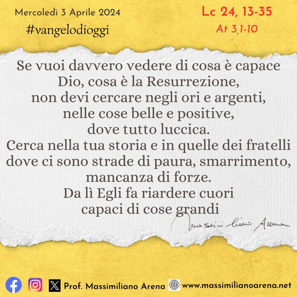 Quando furono vicini al villaggio dove erano diretti, egli fece come se dovesse andare più lontano. Ma essi insistettero: «Resta con noi, perché si fa sera e il giorno è ormai al tramonto». Egli entrò per rimanere con loro. Quando fu a tavola con loro, prese il pane, recitò la benedizione, lo spezzò e lo diede loro. Allora si aprirono loro gli occhi e lo riconobbero. Ma egli sparì dalla loro vista. Ed essi dissero l’un l’altro: «Non ardeva forse in noi il nostro cuore mentre egli conversava con noi lungo la via, quando ci spiegava le Scritture?».