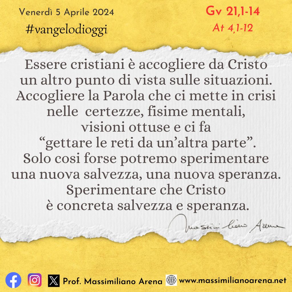 Gesù invita questi discepoli-pescatori a “gettare le reti da un’altra parte”. Avrebbero potuto mandarlo a quel paese, erano già stanchi, ma si fidano della Sua Parola, lo accolgono nella loro barca che è segno della loro vita, segno della Chiesa. Accogliamo la Parola nella nostra vita personale e comunitaria e lasciamoci mettere in crisi per visione oltre noi stessi, diverse da noi. Solo cosi forse sperimenteremo che (come dice la prima lettura anche) Cristo è il Signore.