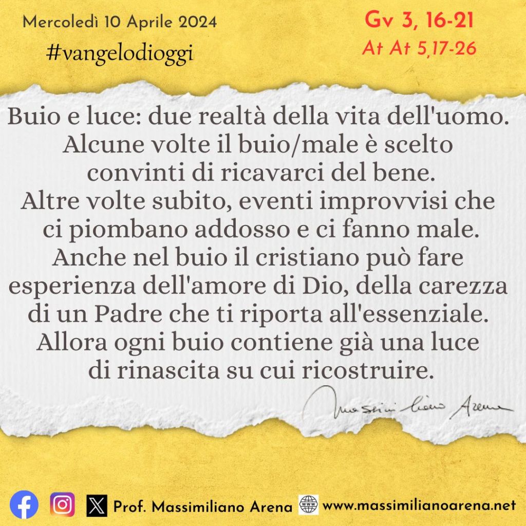 E il giudizio è questo: la luce è venuta nel mondo, ma gli uomini hanno amato più le tenebre che la luce, perché le loro opere erano malvagie. Chiunque infatti fa il male, odia la luce, e non viene alla luce perché le sue opere non vengano riprovate. Invece chi fa la verità viene verso la luce, perché appaia chiaramente che le sue opere sono state fatte in Dio».