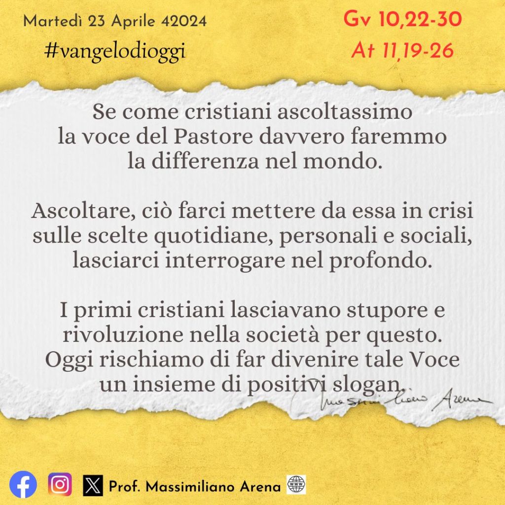 Molti scritti degli storici romani dell’epoca che raccontano delle comunità dei primi cristiani sono meravigliosi nel descrivere la rivoluzione che essi portavano. Quella voce del pastore era il loro criterio con cui misurare tutto e tradurre tutto in Fede, Speranza e Carità. Oggi anteponiamo spesso al potere della Parola tanti interessi nostri, paure, accomodamenti, rischiando di non credere noi per primi alla potenza delle opere di Dio.