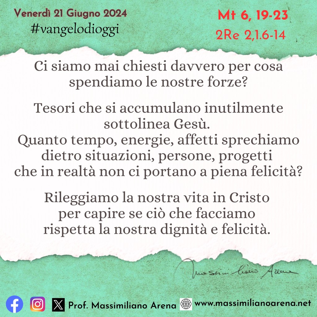 «Non accumulate per voi tesori sulla terra, dove tarma e ruggine consumano e dove ladri scassìnano e rubano; accumulate invece per voi tesori in cielo, dove né tarma né ruggine consumano e dove ladri non scassìnano e non rubano. Perché, dov’è il tuo tesoro, là sarà anche il tuo cuore.