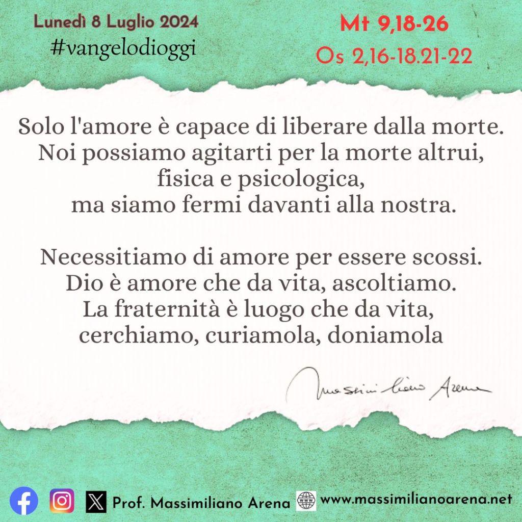 Mt 9,18-26In quel tempo, [mentre Gesù parlava,] giunse uno dei capi, gli si prostrò dinanzi e disse: «Mia figlia è morta proprio ora; ma vieni, imponi la tua mano su di lei ed ella vivrà». Gesù si alzò e lo seguì con i suoi discepoli.