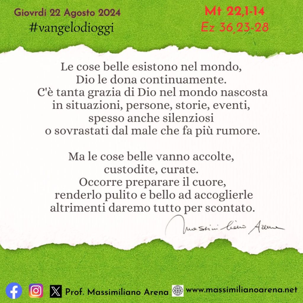 Poi disse ai suoi servi: “La festa di nozze è pronta, ma gli invitati non erano degni; andate ora ai crocicchi delle strade e tutti quelli che troverete, chiamateli alle nozze”. Usciti per le strade, quei servi radunarono tutti quelli che trovarono, cattivi e buoni, e la sala delle nozze si riempì di commensali.