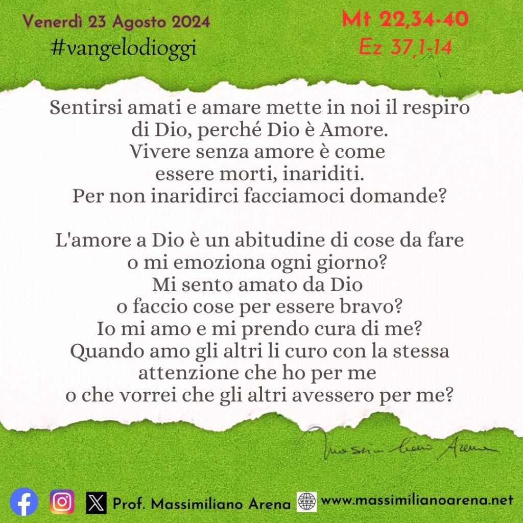 Gli rispose: «“Amerai il Signore tuo Dio con tutto il tuo cuore, con tutta la tua anima e con tutta la tua mente”. Questo è il grande e primo comandamento. Il secondo poi è simile a quello: “Amerai il tuo prossimo come te stesso”. Da questi due comandamenti dipendono tutta la Legge e i Profeti».