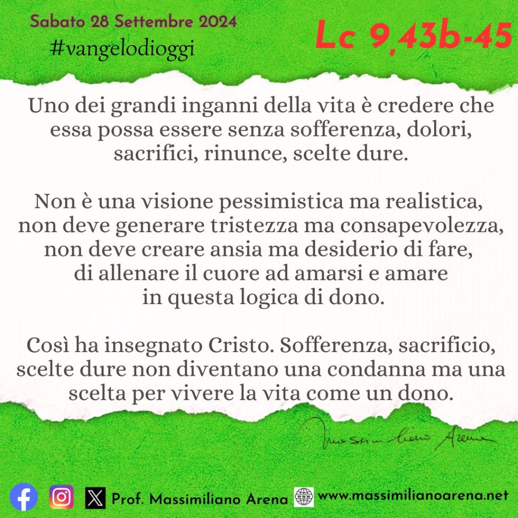 In quel giorno, mentre tutti erano ammirati di tutte le cose che faceva, Gesù disse ai suoi discepoli: «Mettetevi bene in mente queste parole: il Figlio dell’uomo sta per essere consegnato nelle mani degli uomini». Essi però non capivano queste parole: restavano per loro così misteriose che non ne coglievano il senso, e avevano timore di interrogarlo su questo argomento.