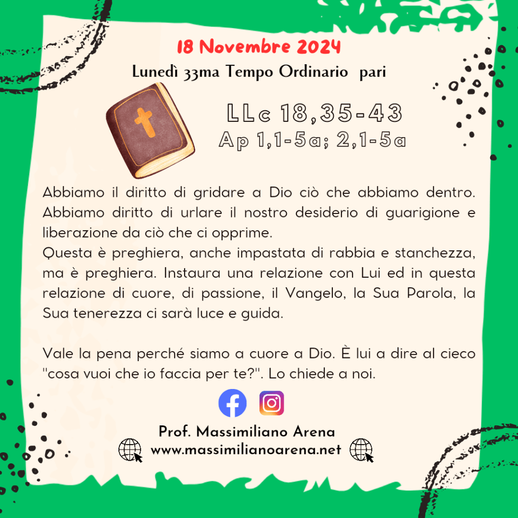 Mentre Gesù si avvicinava a Gèrico, un cieco era seduto lungo la strada a mendicare. Sentendo passare la gente, domandò che cosa accadesse. Gli annunciarono: «Passa Gesù, il Nazareno!».
