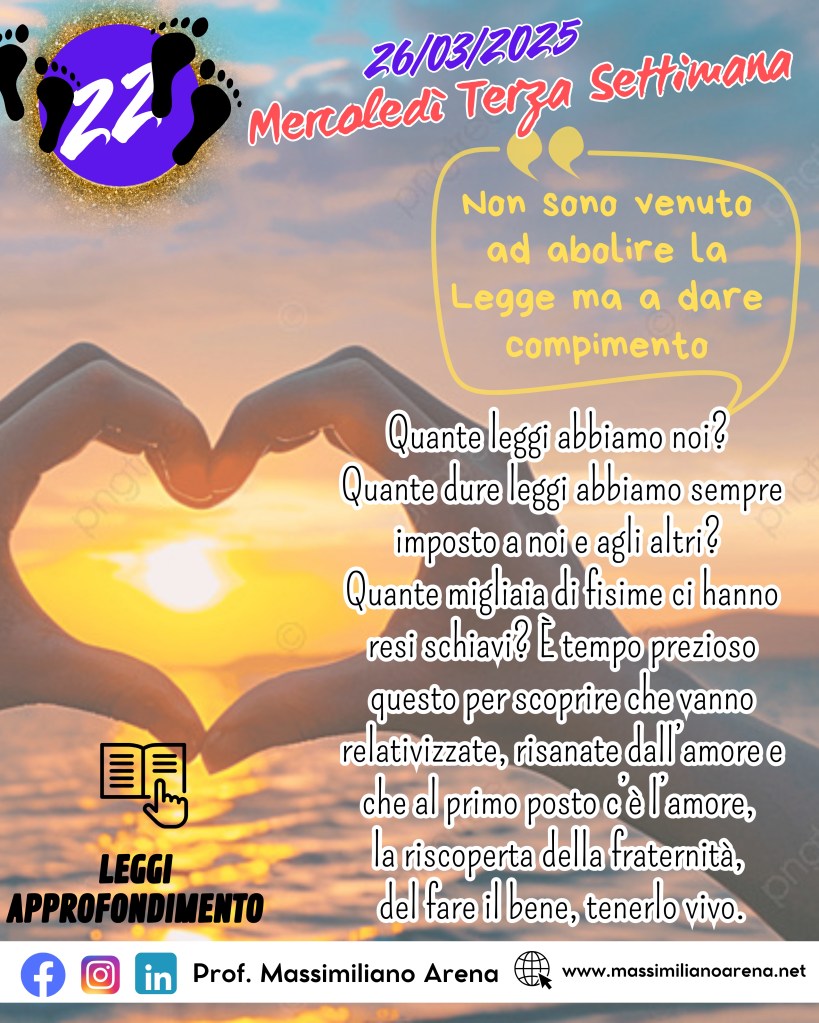 Ma servono le leggi? Non possiamo fare a meno di leggi civili, comunitarie, religiose? La risposta è no, e non è una minaccia alla libertà, ma una garanzia dell’armonia. Occorre solo come Gesù dare “compimento” alla Legge. Cioè aggiungere Lui, Cristo stesso, l’Amore. Si diventa aridi se non su rispettano le leggi, ma si diventa aridi anche vivendole e imponendole agli altri senza l’ingrediente dell’amore.