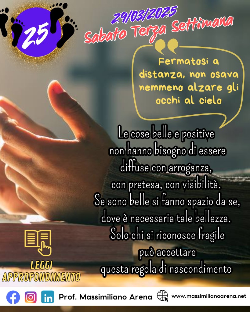 Io vi dico: questi, a differenza dell’altro, tornò a casa sua giustificato, perché chiunque si esalta sarà umiliato, chi invece si umilia sarà esaltato».