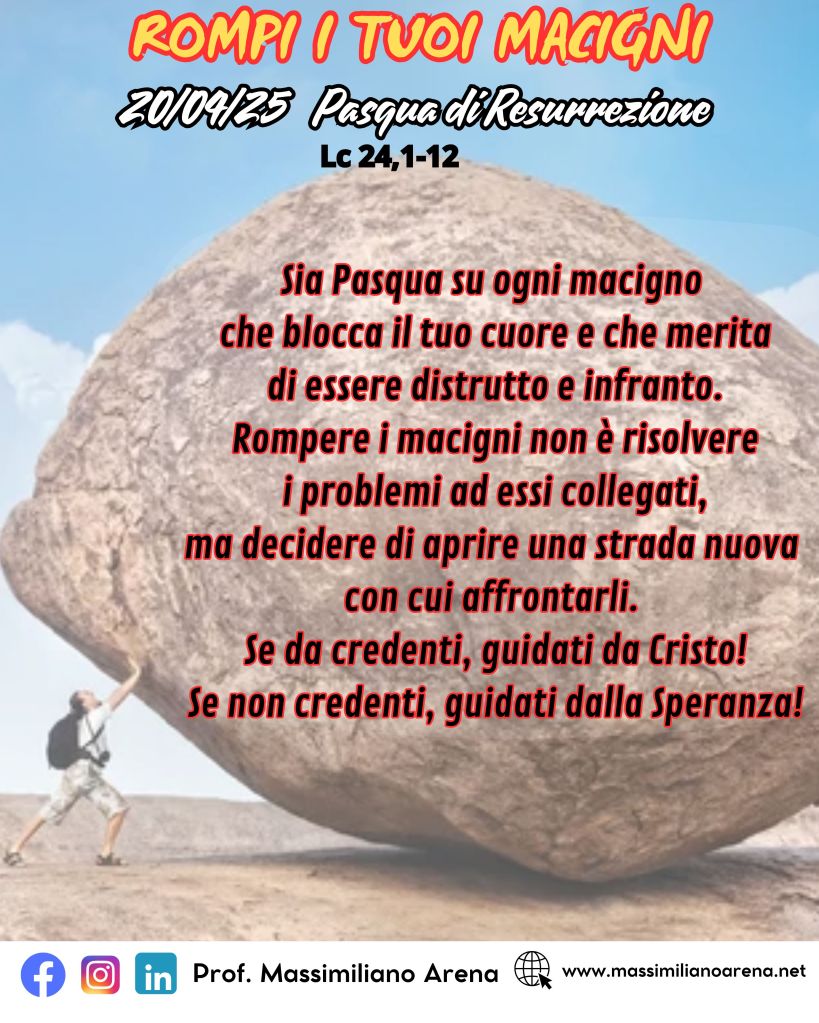 Ultimo giorno di questo percorso quaresimale insieme, 46 passi nel deserto dal Mercoledì delle Ceneri al Sabato Santo. Spero siano stati utili, un percorso alla scoperta di Dio che ci illumina a rileggere, riscoprire, riprogrammare la nostra fragile e meravigliosa umanità.