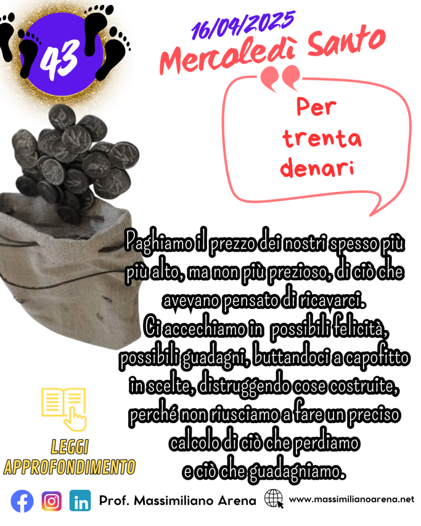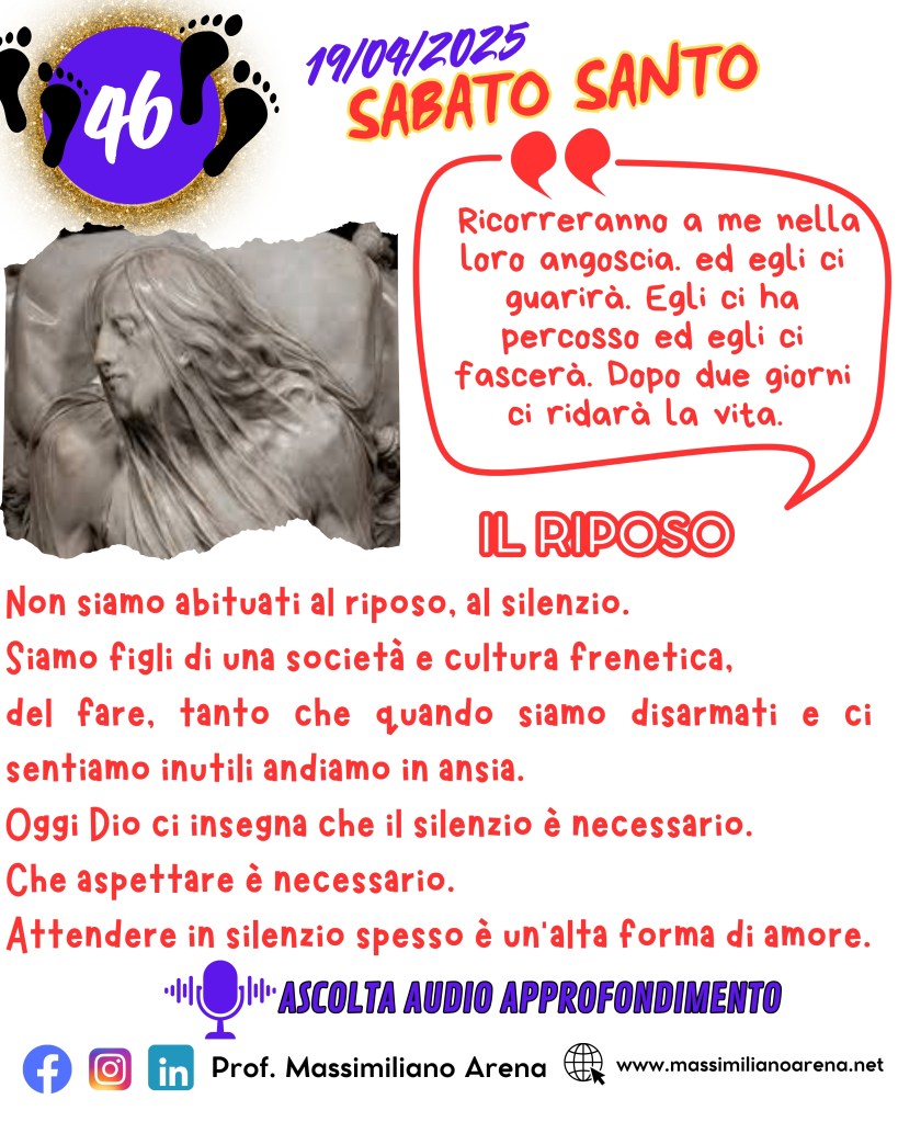 Ultimo giorno di questo percorso quaresimale insieme, 46 passi nel deserto dal Mercoledì delle Ceneri al Sabato Santo. Spero siano stati utili, un percorso alla scoperta di Dio che ci illumina a rileggere, riscoprire, riprogrammare la nostra fragile e meravigliosa umanità.